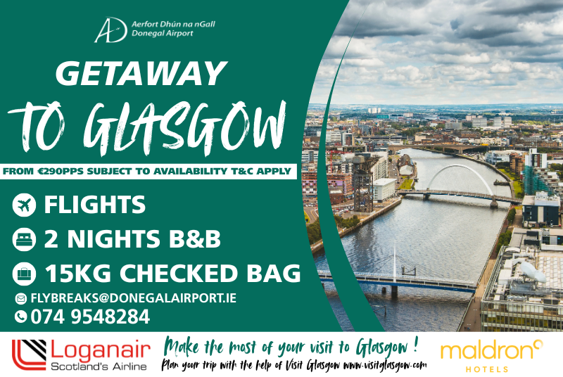 • Return flights from Donegal to Glasgow with Loganair – 15kg checked bag included